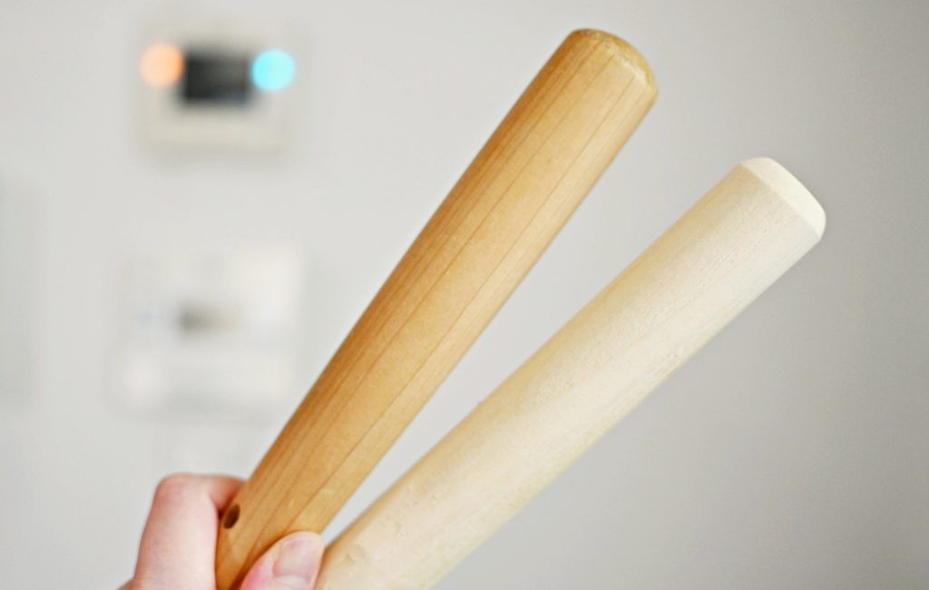 写真左が20年間使ってきためん棒、ではなくすりこぎで、右が新しく買ってきためん棒。