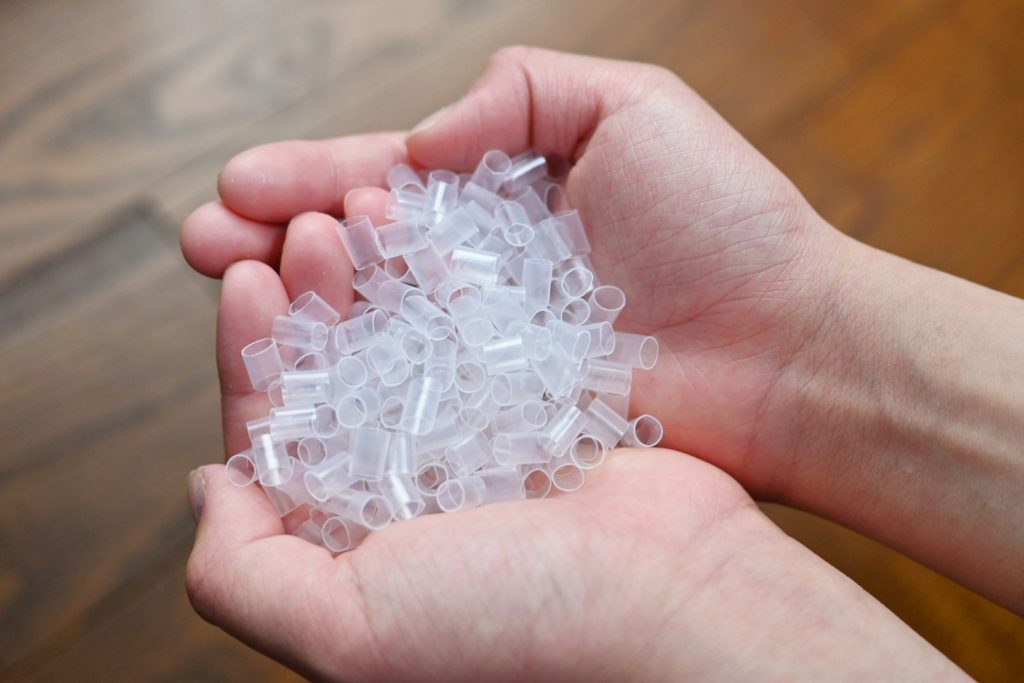 ソフトタイプはふっくら柔らかなポリエステル綿(つぶ綿)、ハードタイプは通気性の良いポリエチレンのパイプ。我が家の枕はハードタイプです。