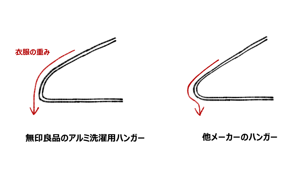 無印良品のハンガーの上部はゆるやかなカーブを描いており、これにより衣服の重みを逃がす(分散する)ことができる。